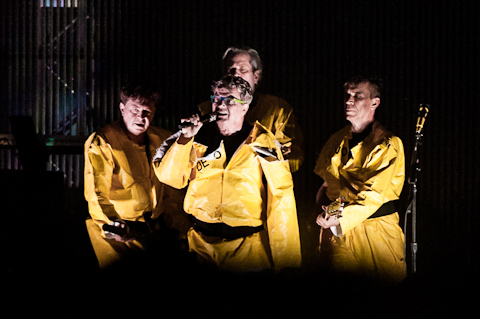 Some of the tunes from the second half included Be Stiff, Gut Feeling, Uncontrollable Urge, and their anthem Jocko Homo. The band members no longer twitched like robots–well, maybe slower robots–but the music didn’t suffer. The only time I winced was during Jocko Homo when Mothersbaugh clambered offstage to share the mic with the crowd during the “Are we not men?” call & response. Not because it’s a hoary bit of stagecraft that’s been stale since the Catskills, but because, when it came time to remount the stage, he vaulted up two feet to roll forward on his belly, swing his legs up with some difficulty, and then struggle upright from a prone position. Ouch.
